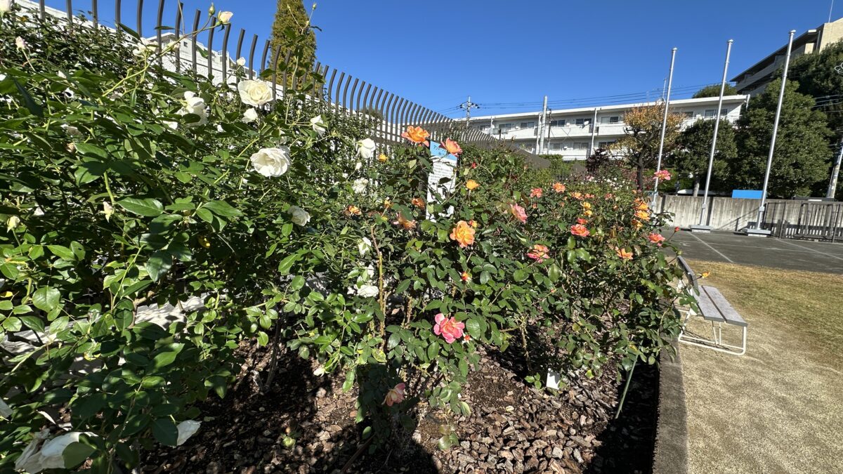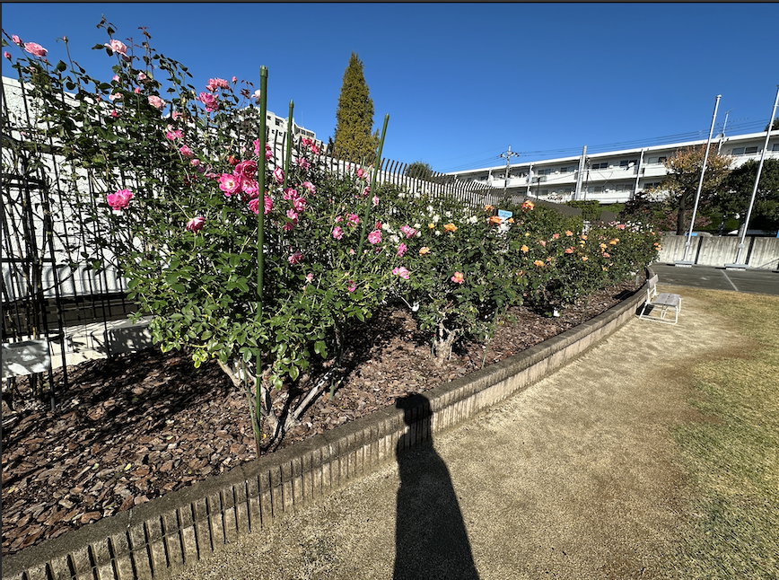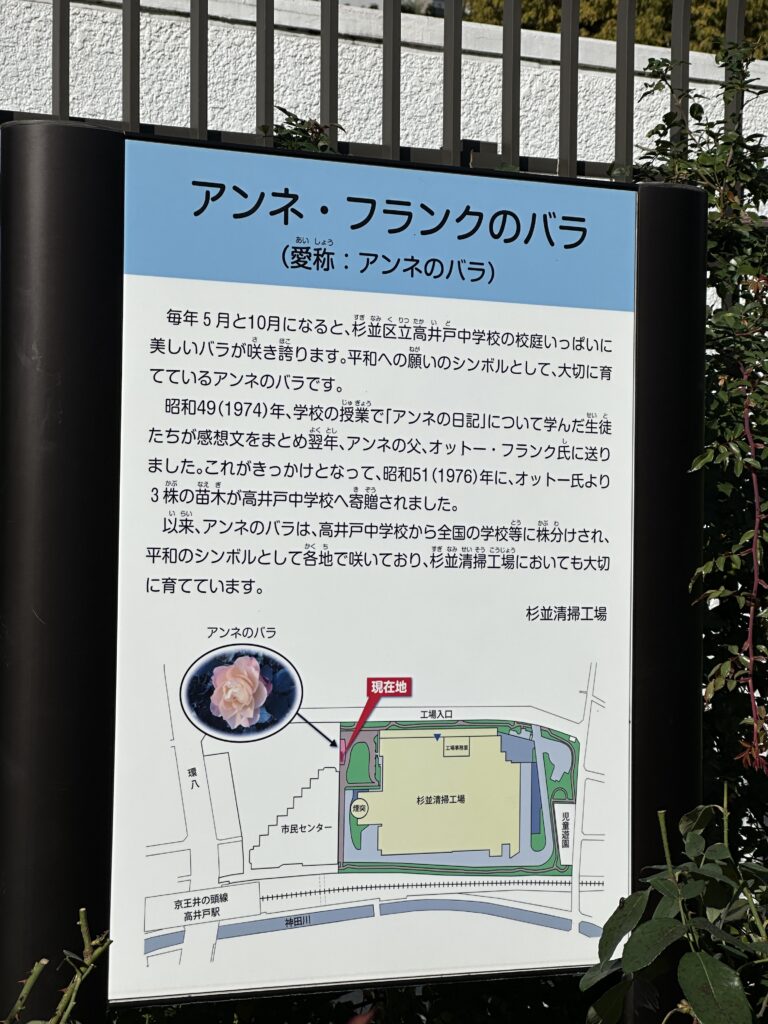 先日、清掃工場周辺を散歩していたところ、美しいバラの花壇と、ある案内板を見つけました。